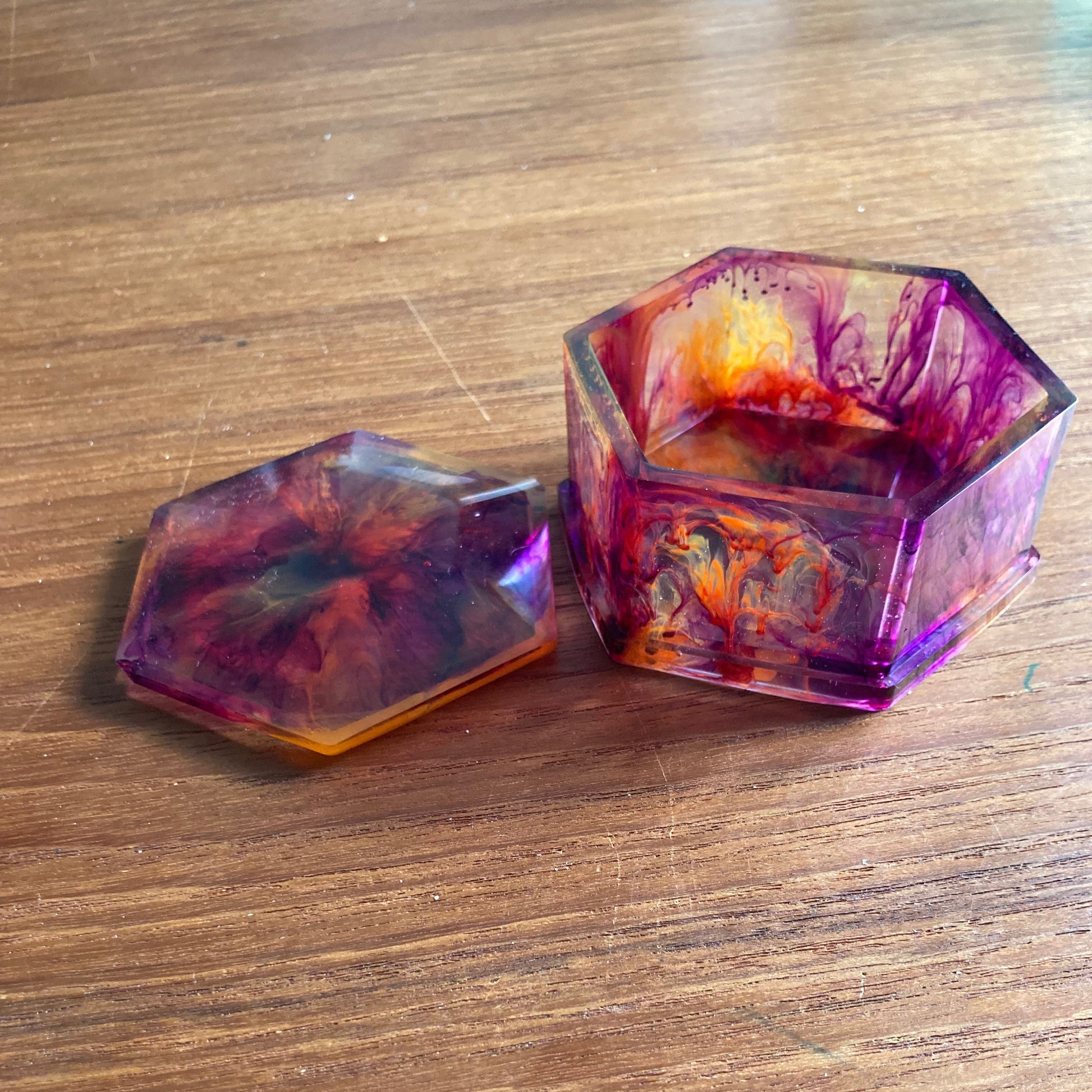 Craquez pour cette boîte décorative en résine époxy, entièrement coulée à la main. Ses reflets marbrés et ses jeux de transparence en font un objet unique : chaque pièce présente des nuances et des effets de profondeur qui lui sont propres.
